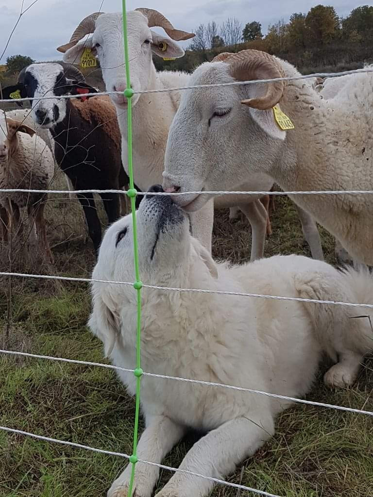 chiens au troupeau notre seul montagne des pyrénees qui merite sa petite photo =) Fauna PIxel et RHea moka et une brebis ROuge du Roussillon Esterina 1 an